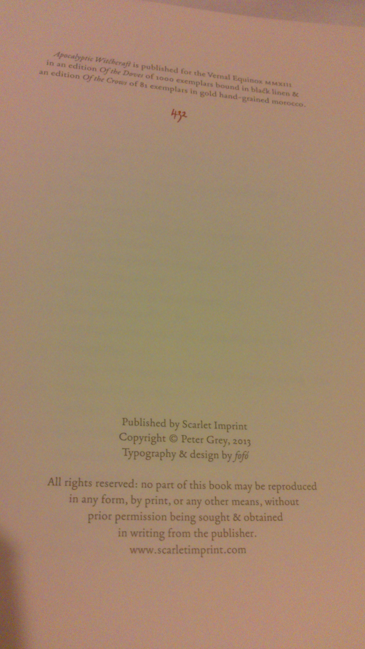 So at last I finally have managed to get around to working on and completing this entry. This is going to be a large one, revolving around a new work released through Scarlet Imprint, known as Apocalyptic Witchcraft. Written by Peter Grey, I believe that this book is another important milestone within the world of Occult Publishing and Witchcraft in general. For those who are already on the fence and have some inkling as to what this book relates to, my whole recommendation and this post can be summarised quickly and simply: it’s an important work, if you are the least bit interested, order a copy at the next available opportunity. For those who have yet to be introduced to this work, and know very little about Scarlet Imprint, hopefully this will be an informative post.