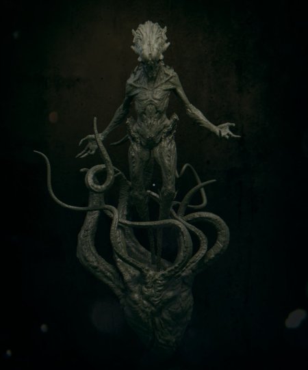 There I saw a horrific monster. On the ends of these arms was something almost indescribable – the Thing seemed to be like a mass of arterial matter – the main trunk made of our two, thick tendrils which seemingly stood upon writhing mass of maggot like appendages, and its ‘head’ appeared like a fleshy venus fly trap. Out of this a single eye upon a long, sinuous tongue like protrusion observed me coldly. Three cancerous growths, like horns, protruded from it, weeping puss. The arms searching outwards from its central mass – looking like they had been spliced or glued onto the main body which was an entirely direct colour and texture; The texture and colour of inflamed and infectious flesh.